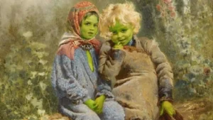 Suatu hari, para penduduk desa menyaksikan dengan takjub saat dua orang anak kecil merangkak keluar dari parit itu. Seorang anak perempuan dan seorang anak laki-laki yang lebih muda. Mereka berdua menggunakan pakaian yang aneh, dan berbicara dalam bahasa yang tidak dimengerti oleh penduduk desa. Namun, yang membuat para penduduk desa keheranan adalah kulit mereka seluruhnya berwarna hijau.
