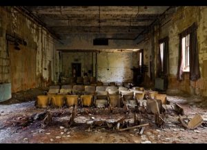 Auditorium terbengkalai dipenuhi dengan kursi dan panggung kecil yang sudah sangat usang. Pada zaman dulu, bangunan seperti ini suduh cukup bagus kualitasnya terbukti dengan adanya fasilitas mesin uap, air, listrik, telepon, dan sistem alarm untuk kebakaran.